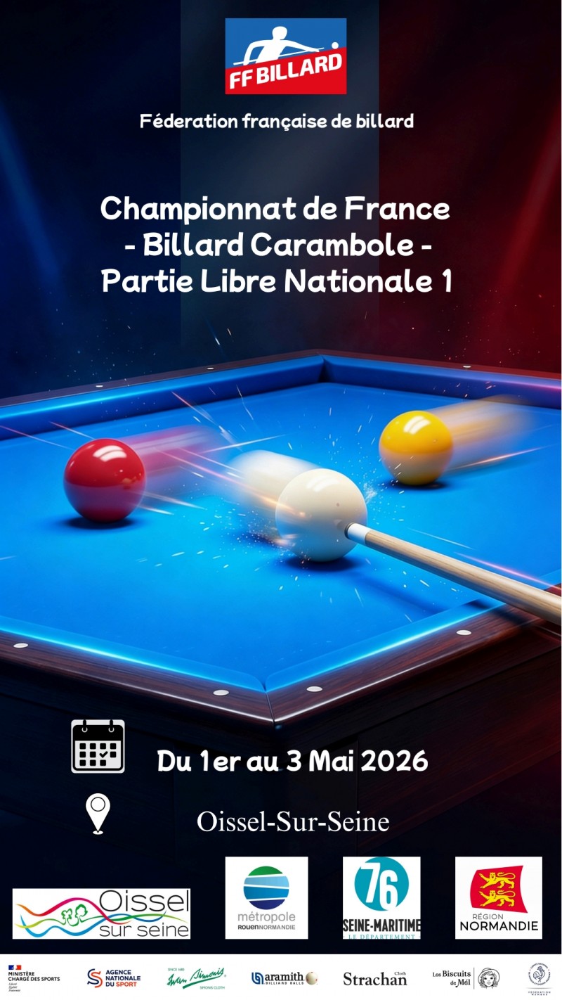 Du 1er au 3 mai 2026, la ville d’Oissel-sur-Seine accueillera la finale du championnat de France de billard français à la Partie Libre Nationale 1. Cet événement rassemblera les joueurs français pour trois jours de compétition au Billard Club Osselien.