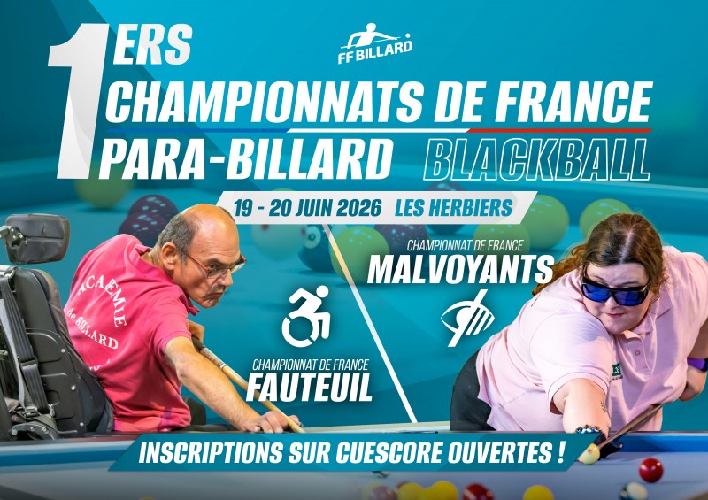 La Fédération Française de Billard annonce l’organisation des tout premiers Championnats de France de Para-Billard en discipline Blackball, un événement structurant pour le développement du billard inclusif en France. La compétition se déroulera les 19 et 20 juin 2026 aux Herbiers.