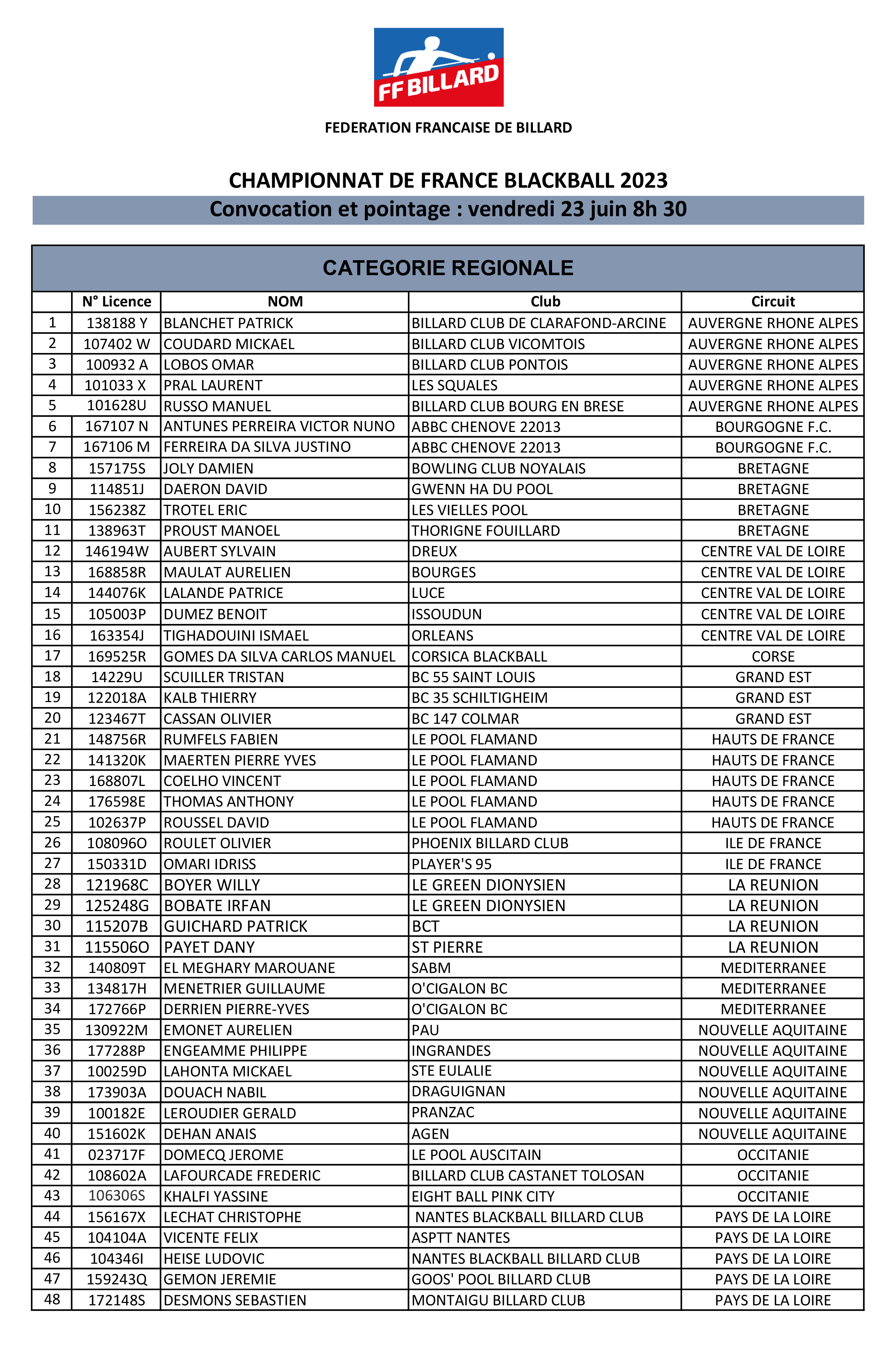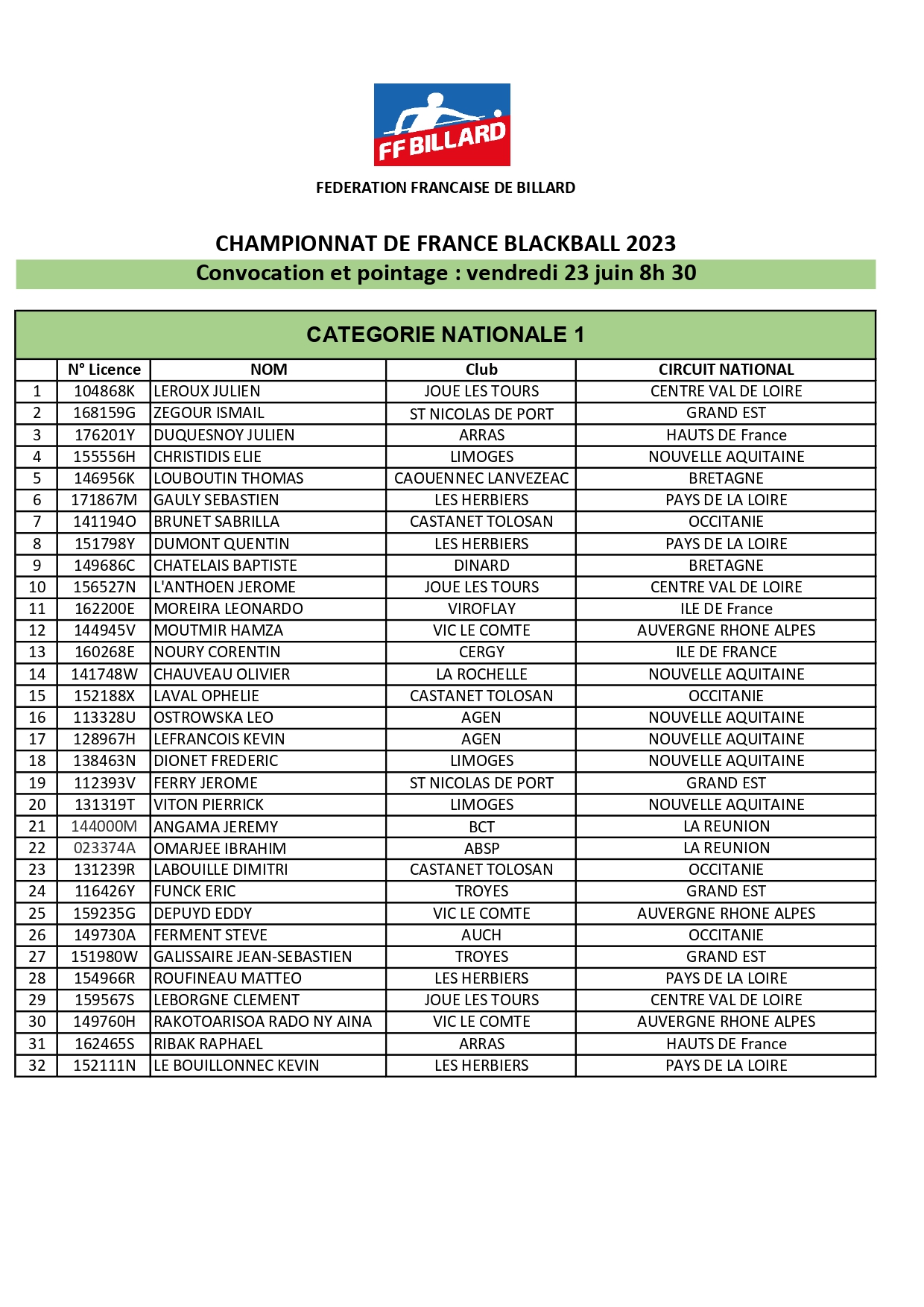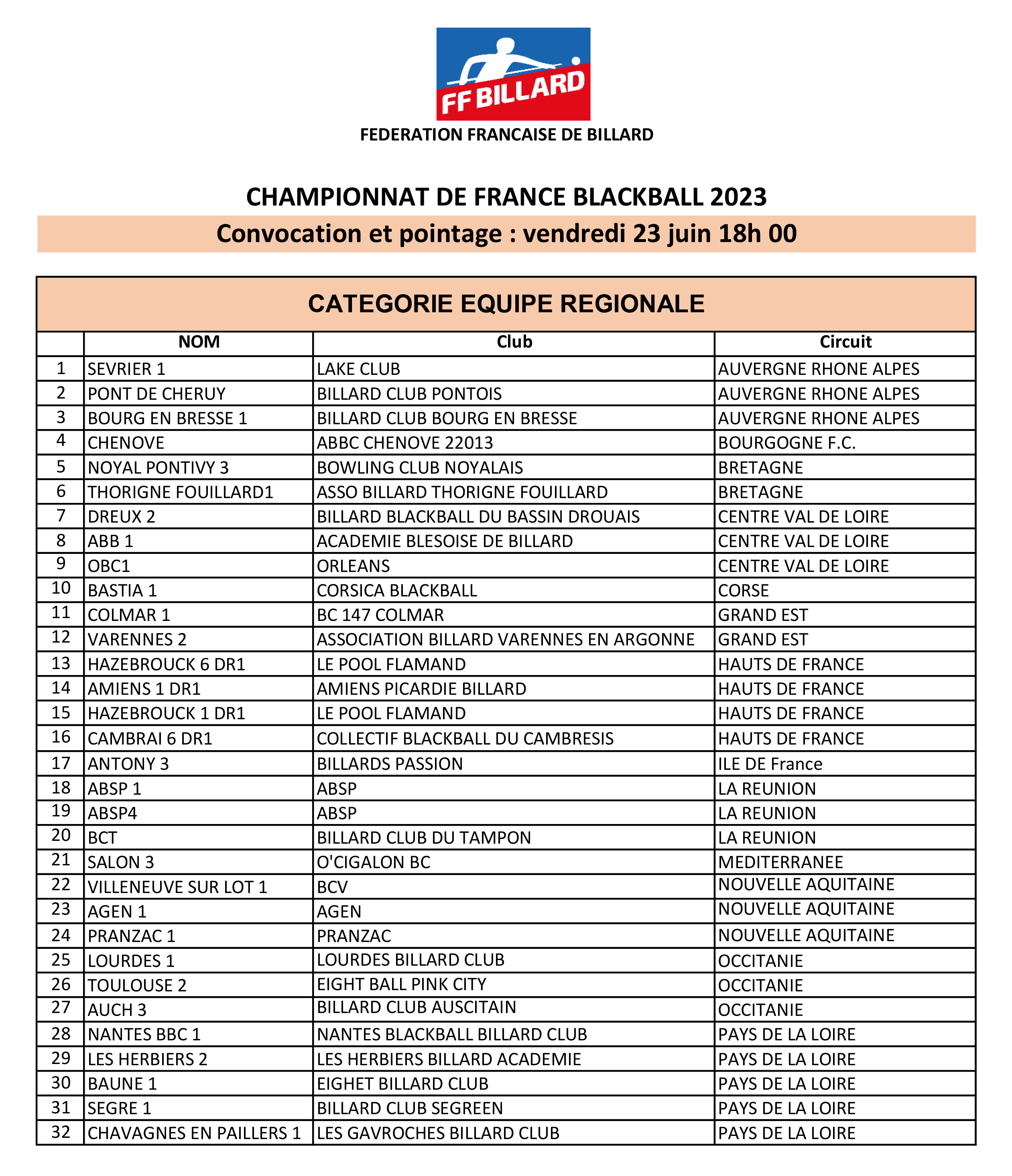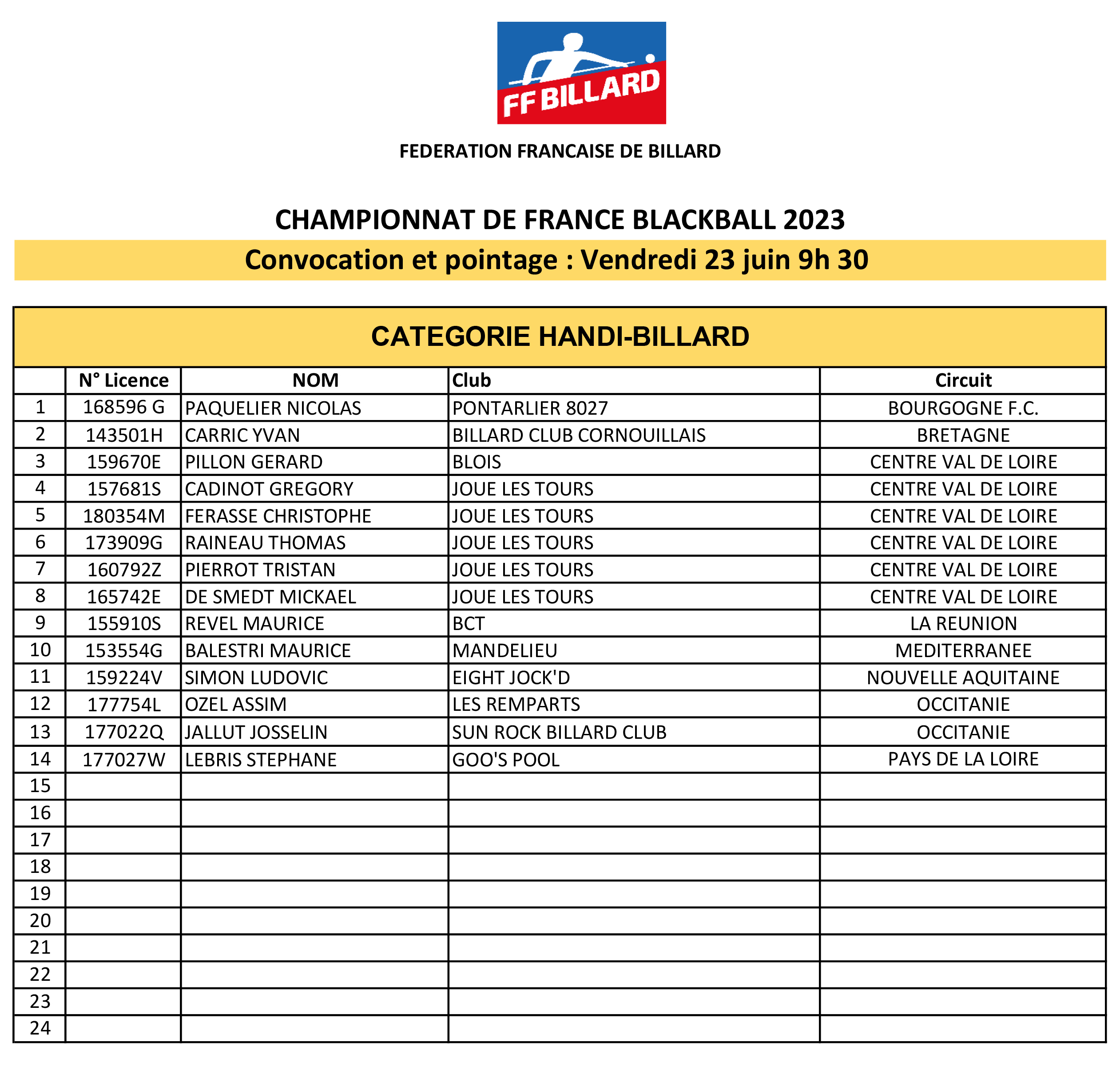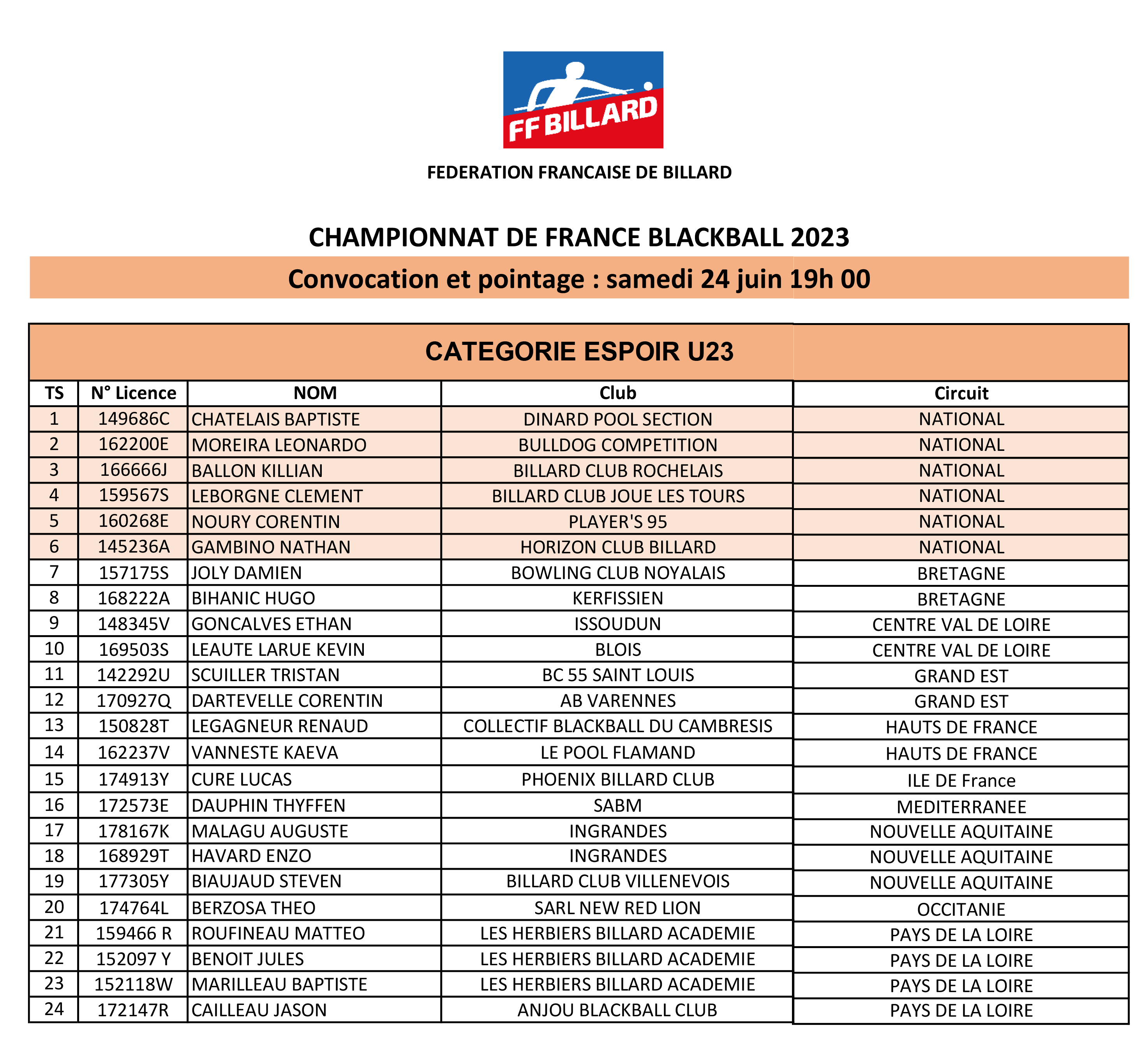 Les convocations pour les championnats de France qui auront lieu du 23 au 25 juin à Montaigu sont disponibles ci-dessous et également accessibles via Compétitions > Blackball > Convocations joueurs.