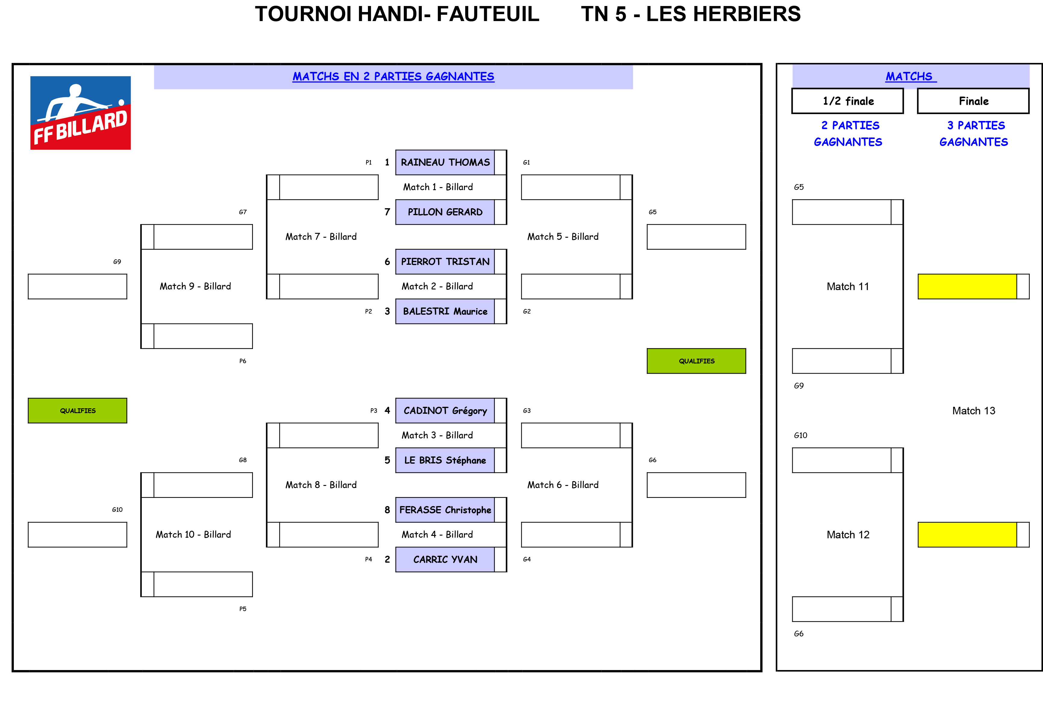 Les convocations en individuels et par équipes ainsi que les tableaux de toutes les catégories pour le tournoi national 5 de blackball aux Herbiers sont disponibles. Vous pouvez les consulter ci-dessous ou sur le site dédié aux compétitions nationales blackball blackballffb.com rubrique inscription / convocation.
