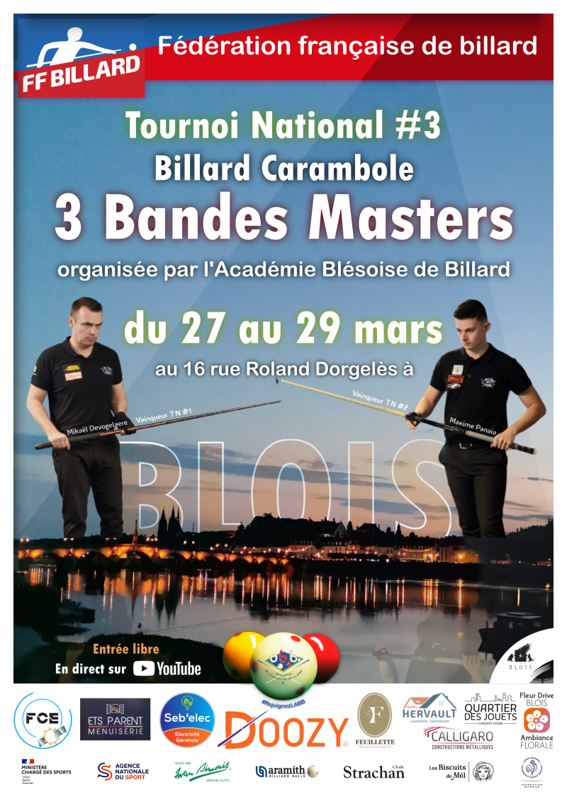 Le 3e tournoi national 3 bandes Masters se déroulera à L'Académie Blésoise de Billard du 27 au 29 mars 2026 ! Les meilleurs joueurs Français seront au rendez-vous pour proposer un spectacle garanti !