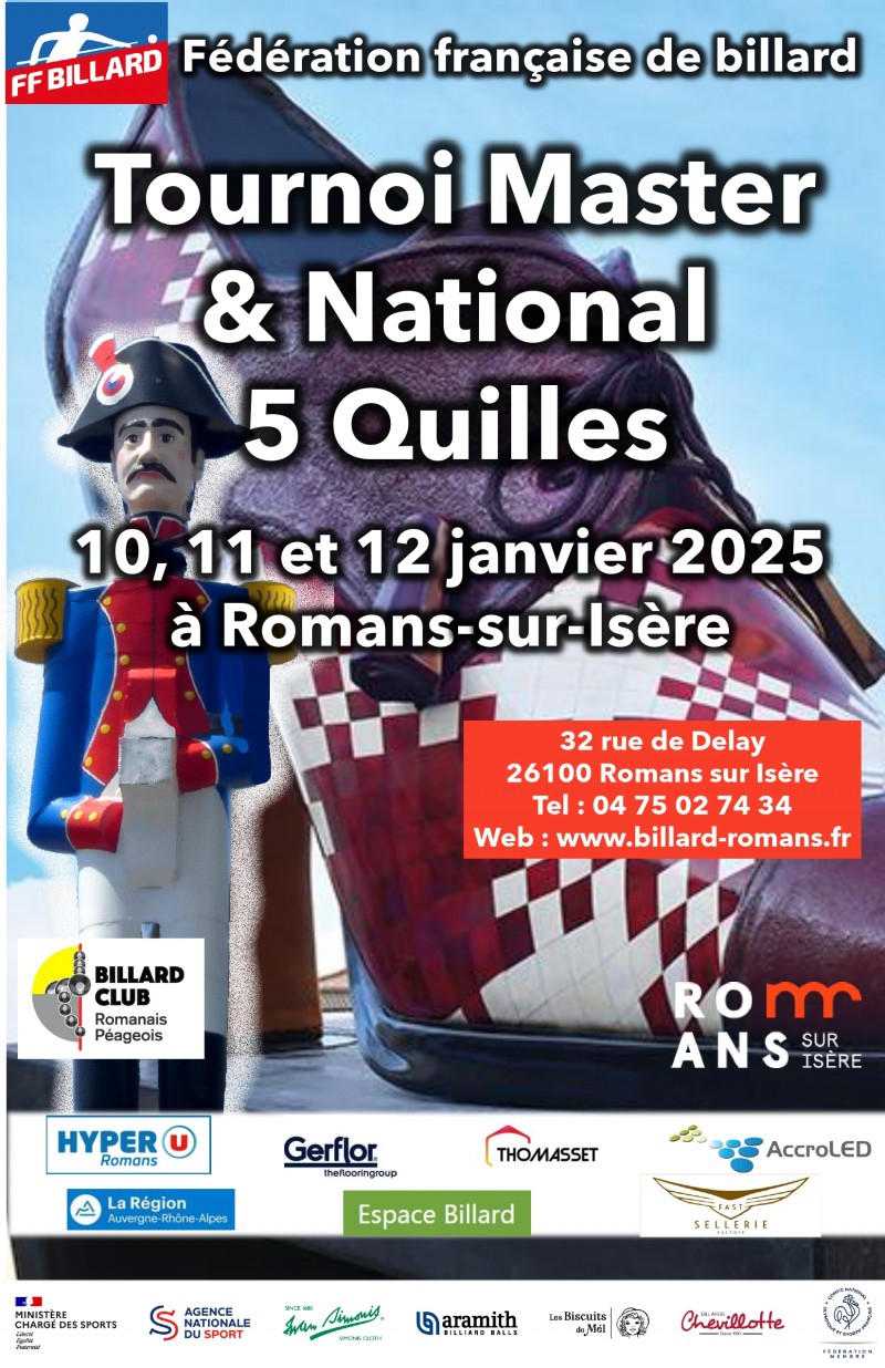 Le 3e tournoi national de la saison au mode de jeu du 5 quilles se déroulera les 10, 11 et 12 janvier 2025 à Romans-sur-Isère.