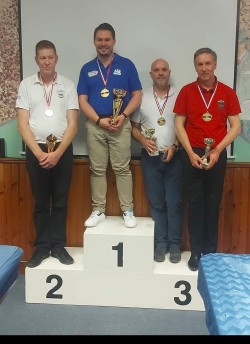 Début de soirée, un maigre public assiste à la proclamation des résultats. La Fédération française de billard est remerciée de la confiance accordée à l’Académie de Billard de Saint-Dizier. Le délégué fédéral Régis Valière proclame Champion de France Jordan AUBERT du BC Mussipontain (Ligue Grand Est).