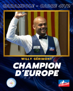 Quelle belle semaine pour le sport billard Français, grâce à notre représentant Willy Gérimont, qui a été à la hauteur de cet événement annuel des jeux de série, regroupant les 3 modes de jeu de référence, à savoir la bande, le cadre 47/2 et le cadre 71/2.