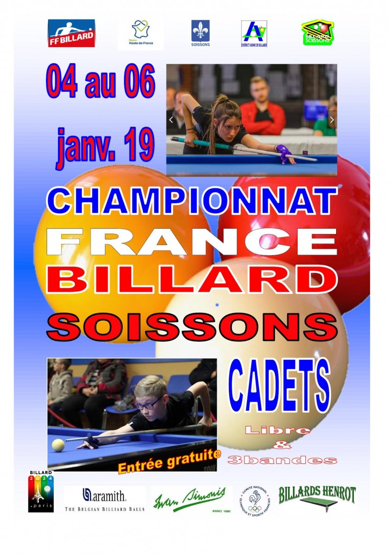Le Championnat de France Cadets « partie libre et 3 bandes » se déroulera du 04 au 06 janvier 2019 au Billard Club de Soissons.