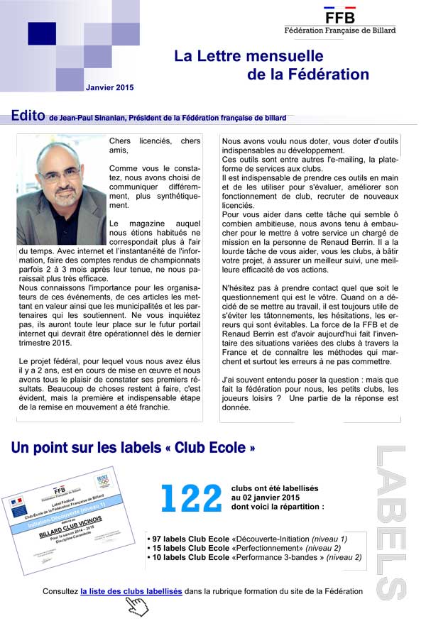 Vous pouvez dès à présent consulter la lettre de la Fédération pour le mois de janvier.