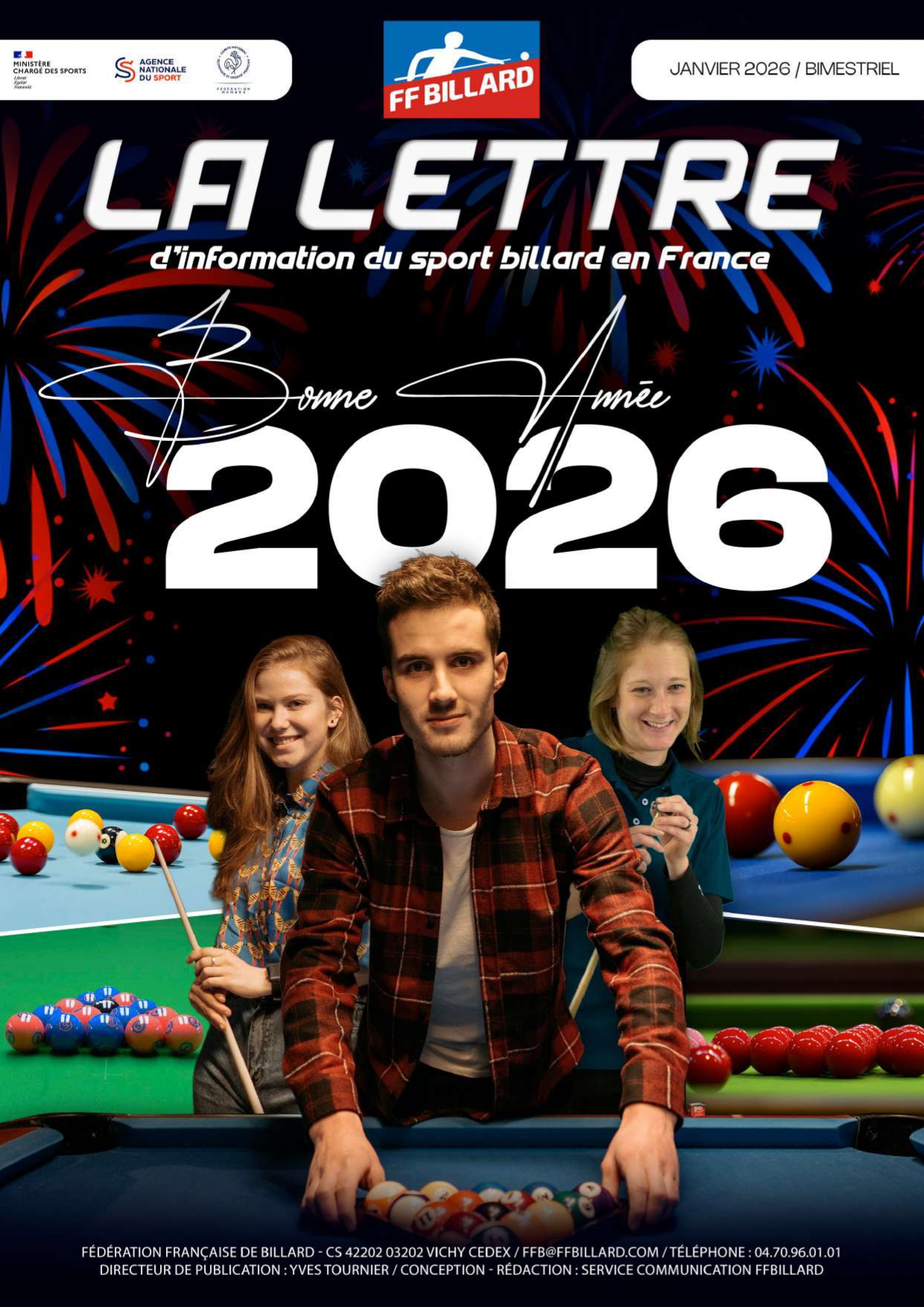 Ce numéro de janvier 2026, intitulé « Bonne année 2026 », revient sur l'année 2025 riche en médailles internationales pour nos Bleus, en plus des rubriques habituelles qui vous permettent de découvrir l'actualité billard et le fonctionnement de la Fédération.