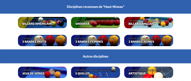 Retrouvez les différents parcours par discipline (Carambole 3 bandes, Artistique, 5 Quilles, Jeux de séries, Snooker et Américain) sur le site fédéral, rubrique Haut niveau.