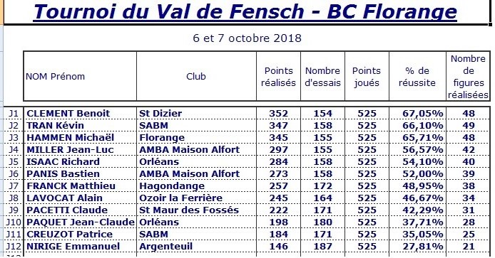 Le samedi soir, après quarante figures, les scores sont proches : K. Tran (28 fig, 203 pts, 67,67%), B. Clément (26 fig, 190 pts, 63,33%), M. Hammen (26 fig, 188 pts, 62,67%), J-L. Miller (24 fig, 175 pts, 58,33%), B. Panis (23 fig, 160 pts, 53,33%), C. Pacetti (21 fig, 154 pts, 51,33%), R. Isaac (21 fig, 145 pts, 48,33%), A. Lavocat-Dubuis (19 fig, 138 pts, 46%), M. Franck (20 fig, 135 pts, 45%), J-C. Paquet (15 fig, 111 pts, 37%), P. Creuzot (14 fig, 107 pts, 35,67%), E. Nirige (11 fig, 73 pts, 24,33%).